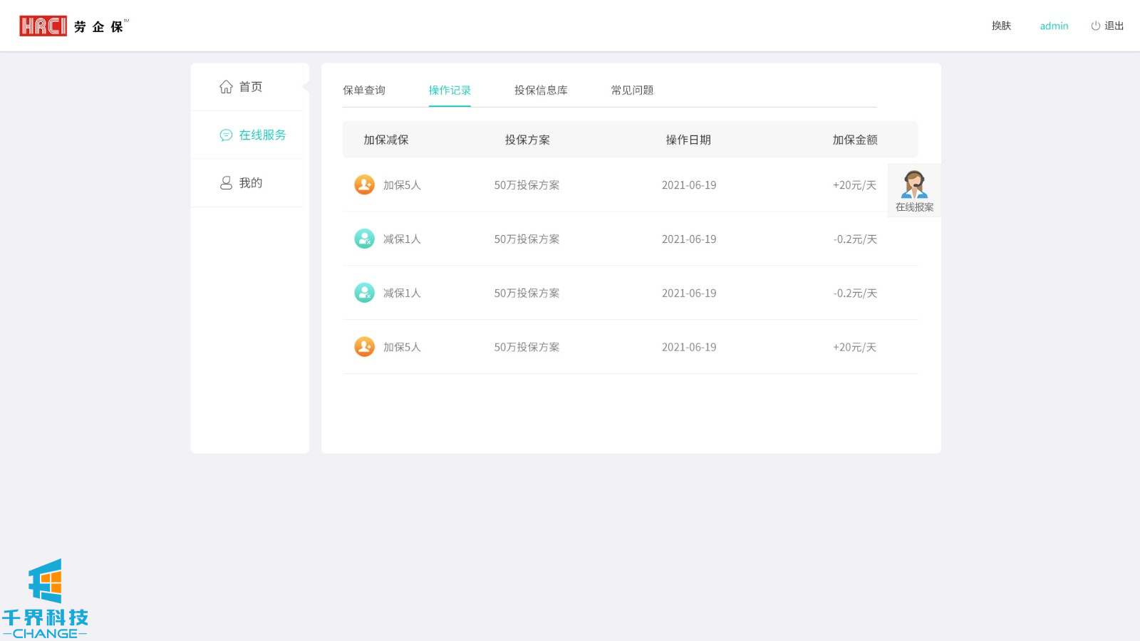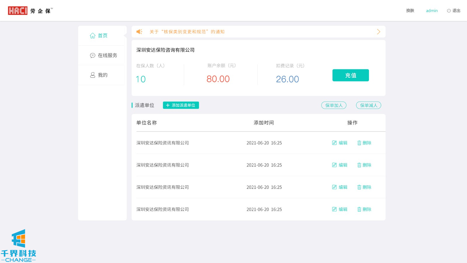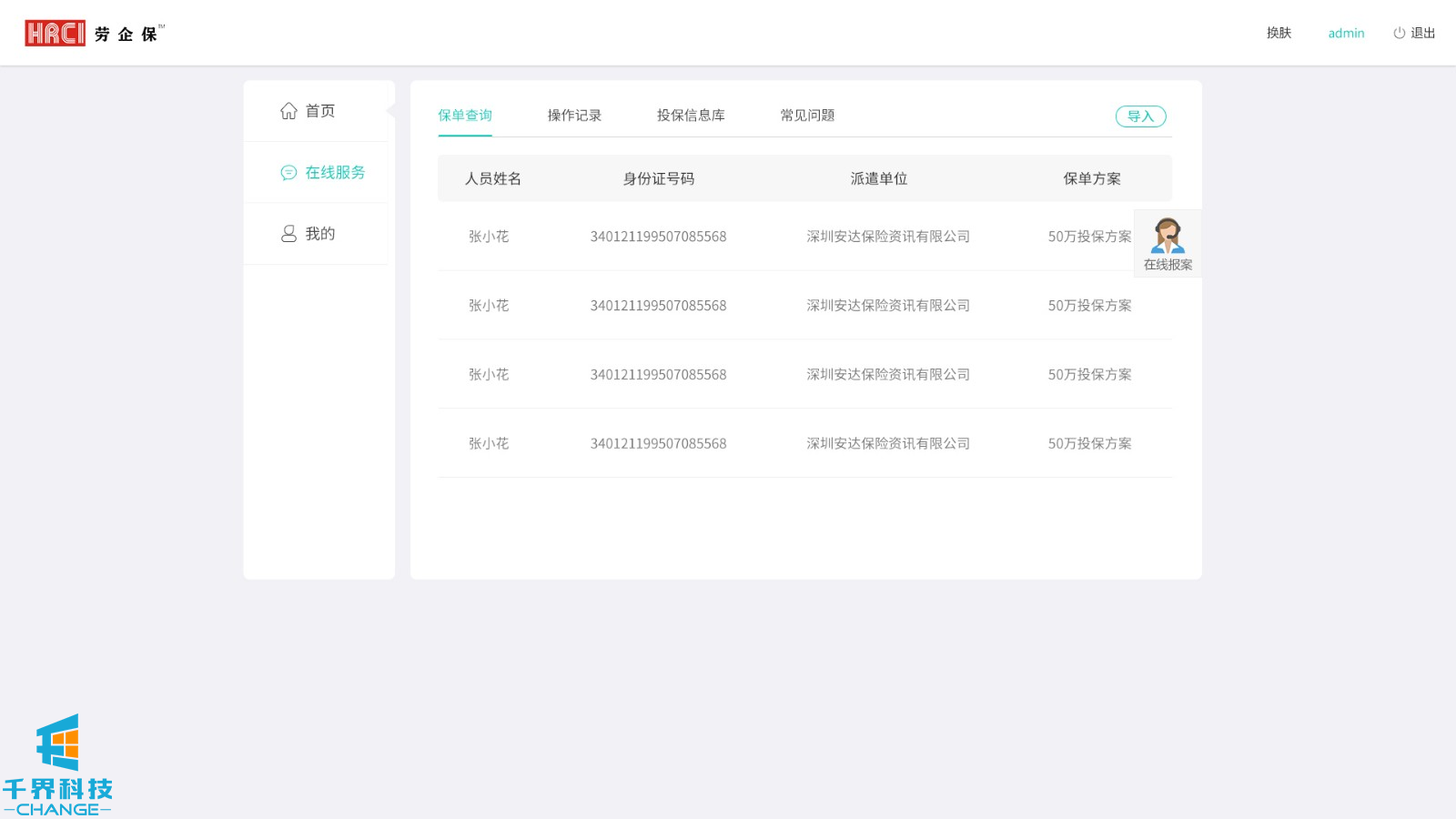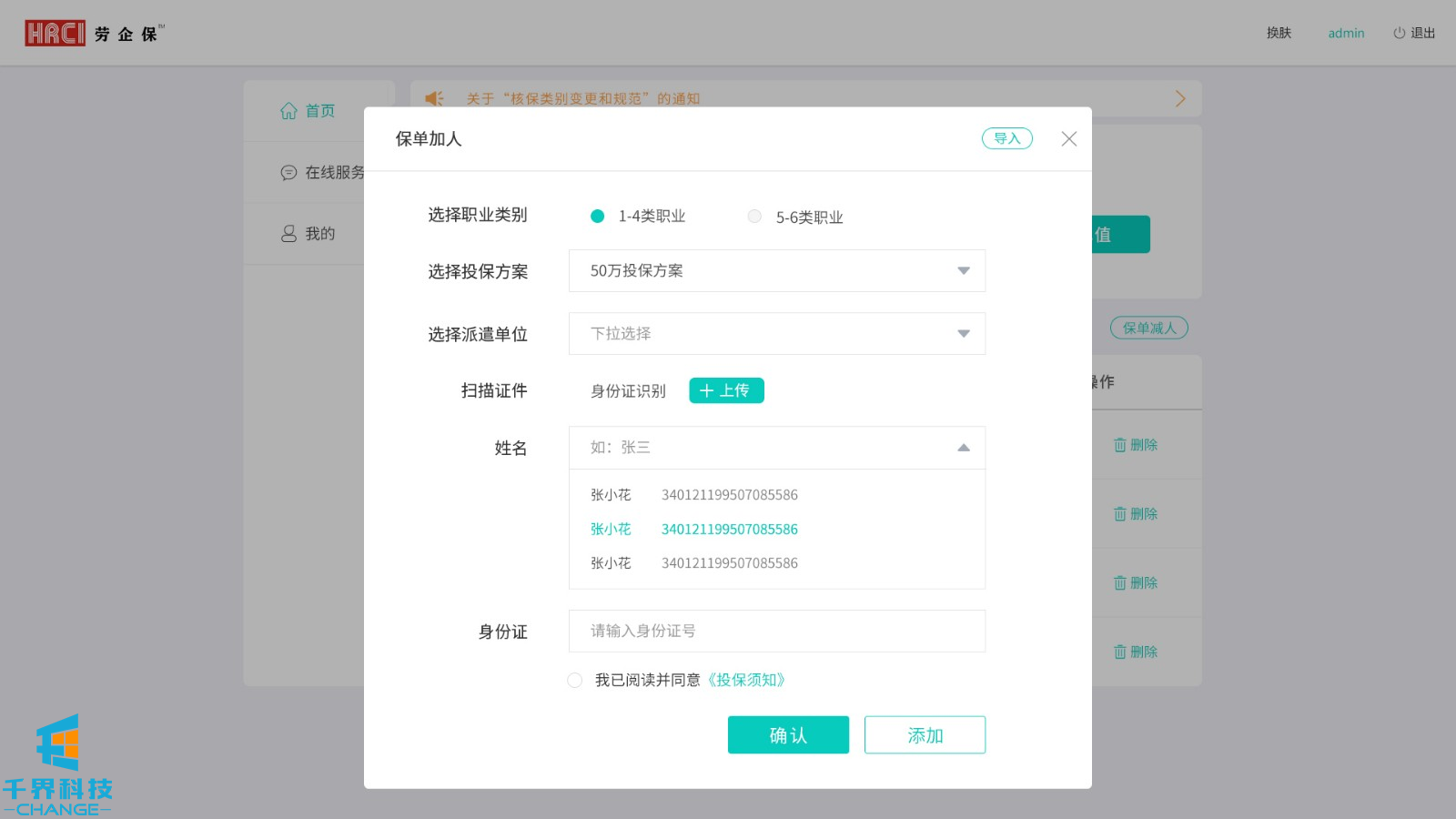 該項目用戶(hù)群體為人力資源公司,后臺創(chuàng )建賬號密碼,用戶(hù)登錄,添加派遣公司,選擇投保方案,為勞工加保、減保,可在線(xiàn)申請發(fā)票。