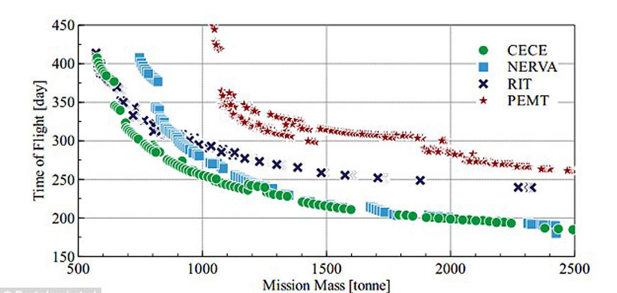 當然這是基于當前火箭技術(shù)的考量,如果美國宇航局在2030年代還無(wú)法使用更先進(jìn)的推進(jìn)系統,比如核動(dòng)力火箭,那么登陸火星無(wú)疑將花費很長(cháng)時(shí)間。因此Bertolami博士認為在未來(lái)十多年的時(shí)間內美國宇航局如果沒(méi)有能力實(shí)現核動(dòng)力火箭的研制,那么2030年登陸火星不太可能實(shí)現。圖中顯示的為不同推進(jìn)系統的載荷與時(shí)間曲線(xiàn),從中可以看出藍色的核電推進(jìn)效率很高,可攜帶更多的載荷,飛行時(shí)間也更短。